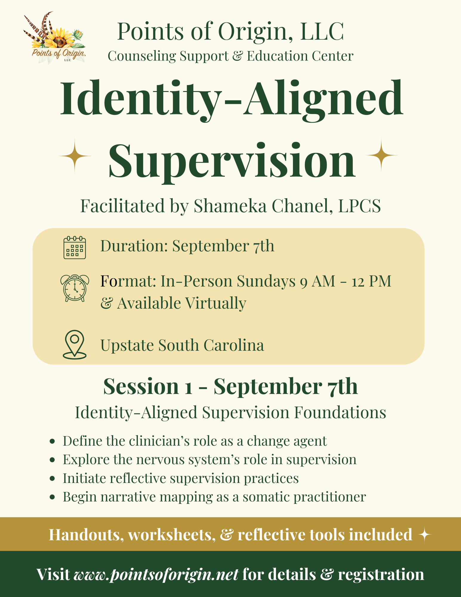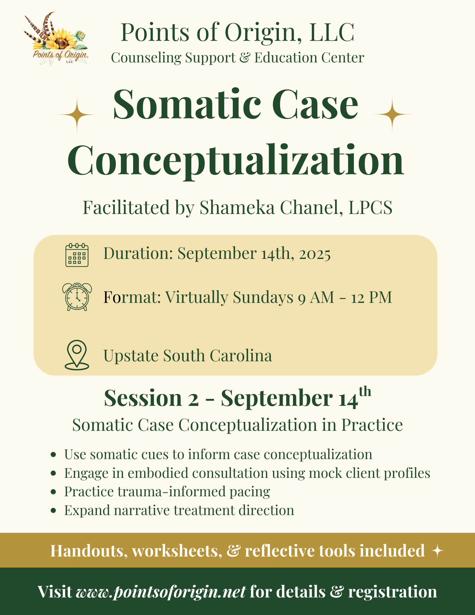 Led by Shameka Chanel, LPCS – Clinical Supervisor, Certified Somatic Clinician, Educator & Advocate, this six-session experience integrates reflective supervision, somatic education, and embodied clinical leadership (quiz included).